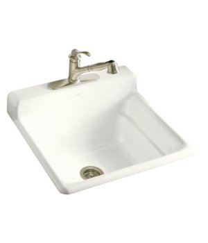 Bayview- self-rimming utility sink with single-hole faucet drilling on top of backsplash The Bayview single-basin utility sink is ideal for the hardest-working rooms of the home. This self-rimming unit features durable KOHLER Cast Iron construction, a single-hole faucet drilling on the front of the integrated backsplash, and a generous 11" basin depth. Single-basin utility sink with installation and faucet options 25-1/2" x 24" x 11" deep Sink models available with a two-hole faucet drilling in backsplash and with a three-hole faucet drilling on top of backsplash For self-rimming countertop installation; sink model available with black painted underside for installation in optional wood sink stand